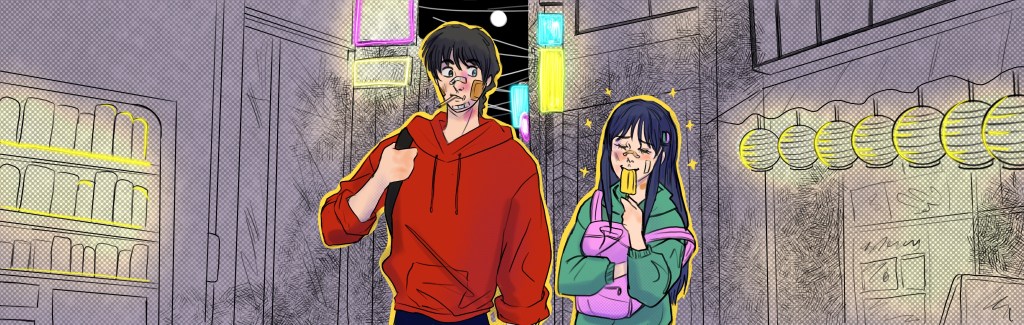 Ranma leaves the combini with a bag in his hand and a pleased face. He hands me a tonkatsu and egg snack, I can’t believe it.