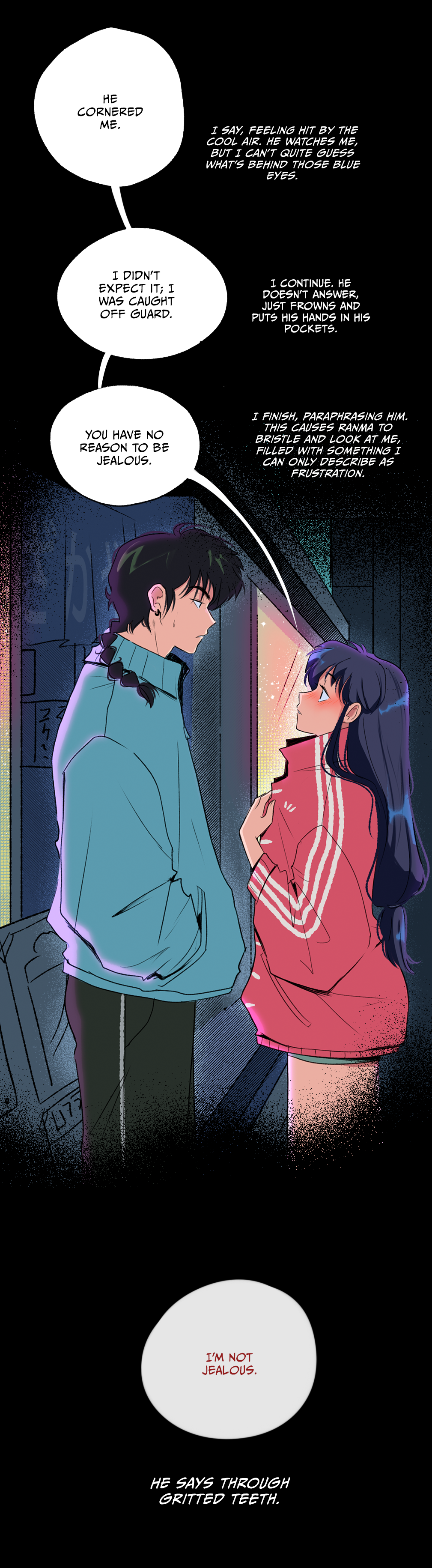 «I have…I have plans today,» I say evasively, because I don’t want him to be part of what I have planned. I’m going to face Kuno, and I don’t want to get him into any more trouble than he already is. Ranma lowers his gaze, looking disgruntled, almost hurt.