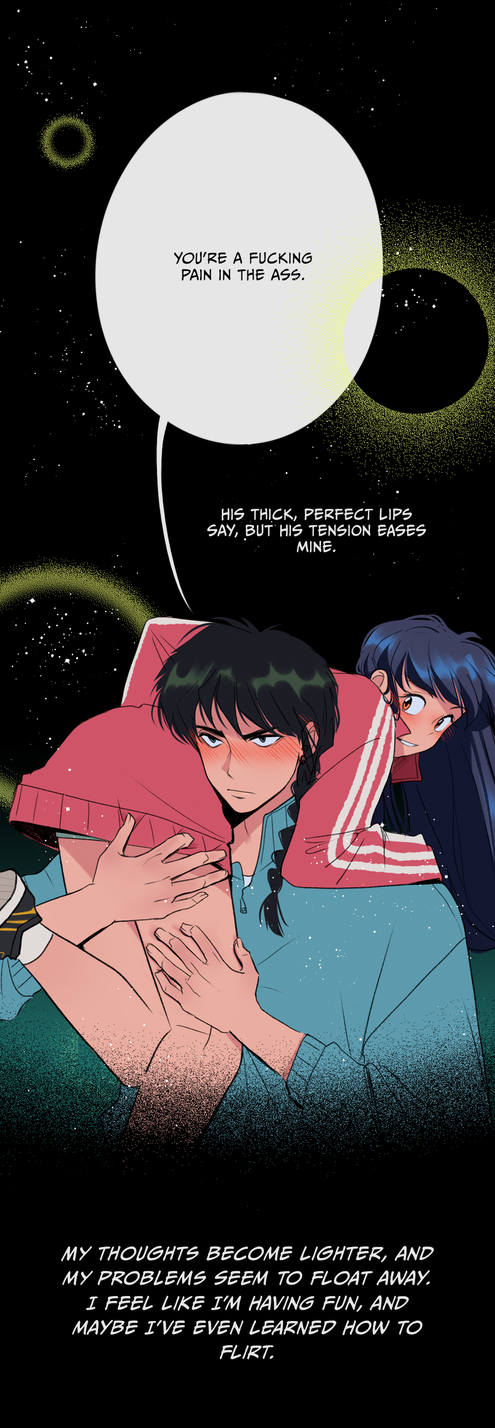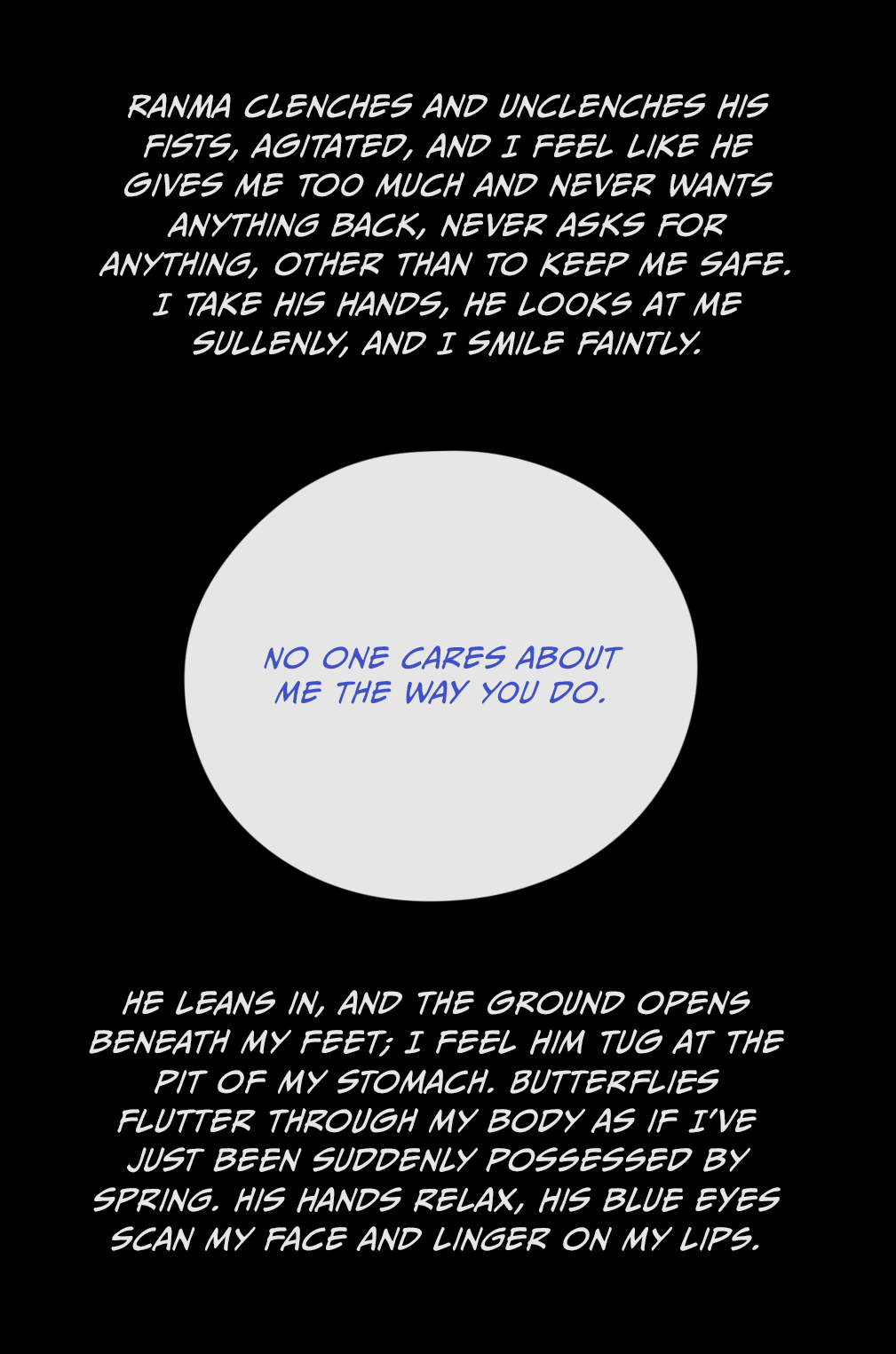 My stomach lurches at the thought of Ranma finding us in the alley. Would he have gotten angry like the other day? Or would he have turned away? Either way, I can’t even express the amount of relief I feel that I told him not to come today.