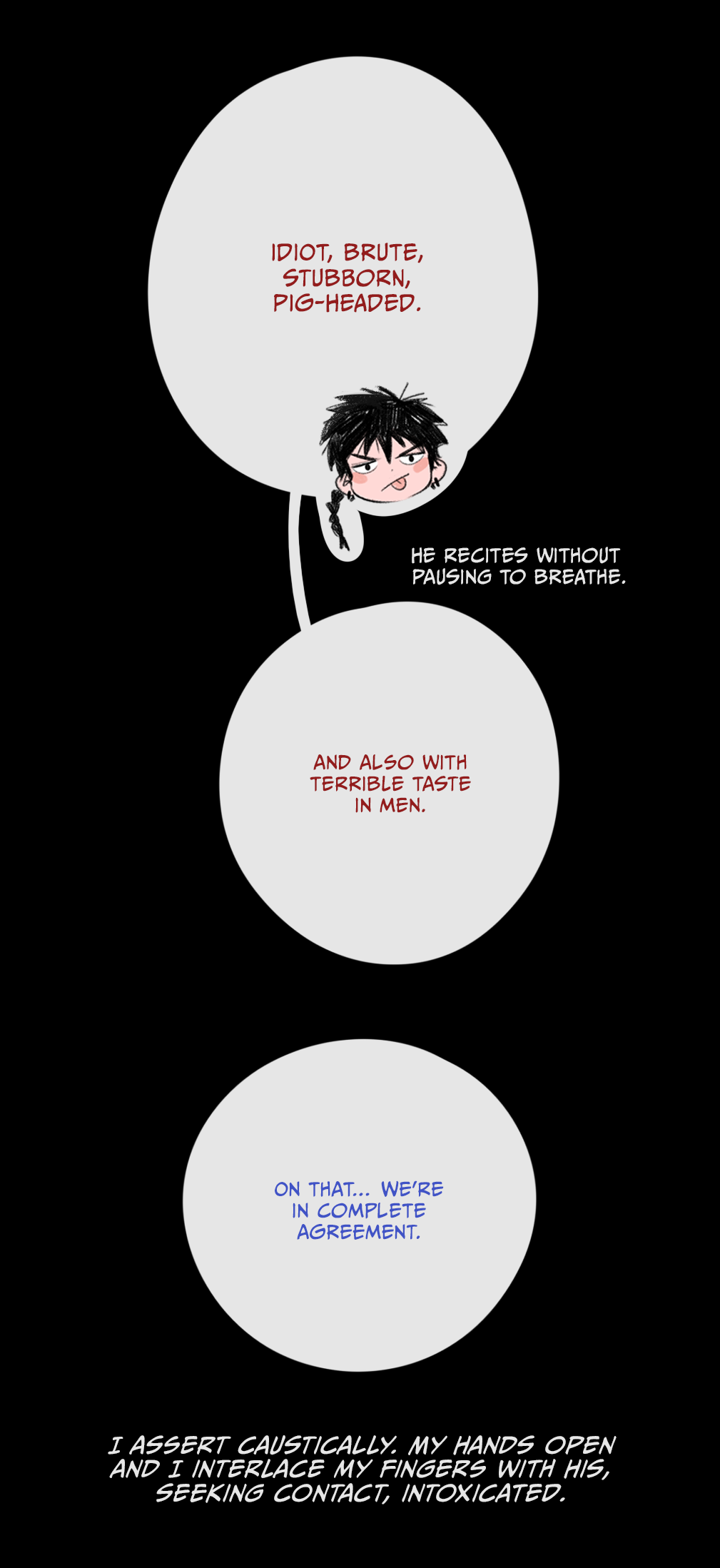 «Ummh,» Ranma sips his beer and clenches his jaw. He’s as tense as a bowstring, but I can’t stop. I’m tumbling down a slope where the finish line is wallowing in a million layers of self-pity.
